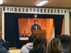 開会式で和田全日本下の句歌留多協会会長は「今日はこれまで練習してきたことを発揮していい日です、この舞台に立てることを誇りに思ってください。勝敗にこだわることはもちろんであるが何よりも元気よく歌留多を楽しんで欲しい。そして相手がいるからこそ試合ができる、このことを忘れず相手に対する敬意を大切にしてください。この大会を通じて選手の皆さんがもっともっと歌留多が好きになる大会になって欲しい」と激励しました。